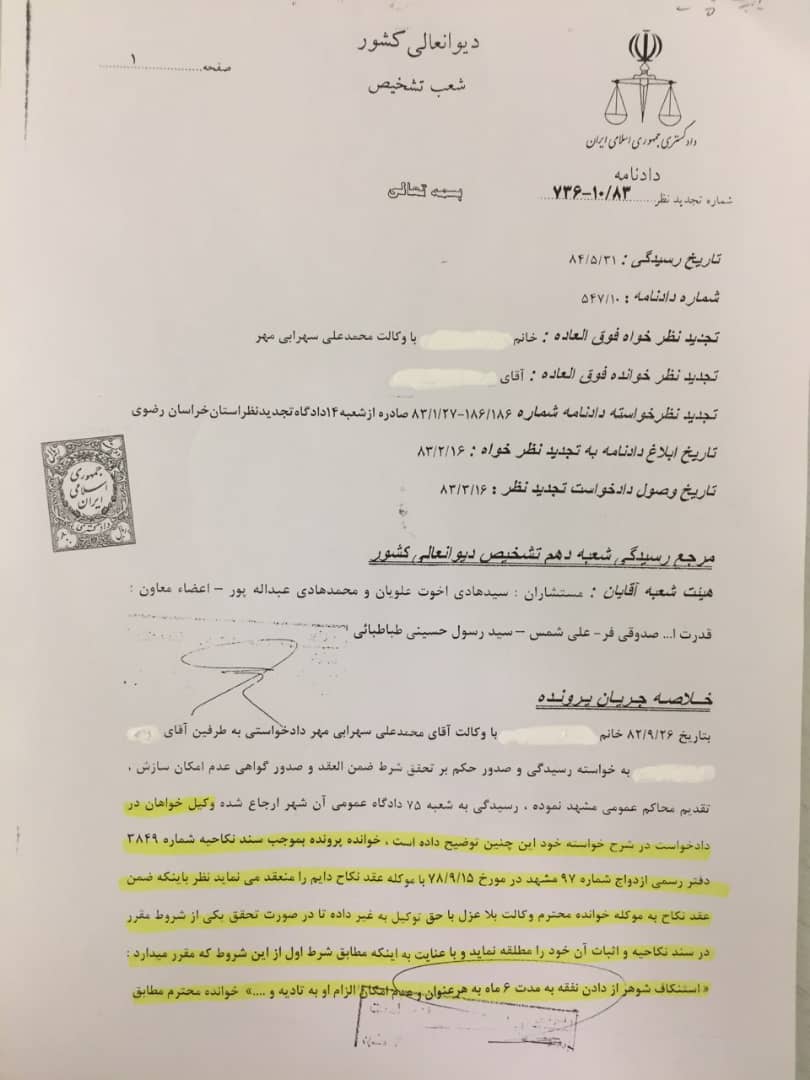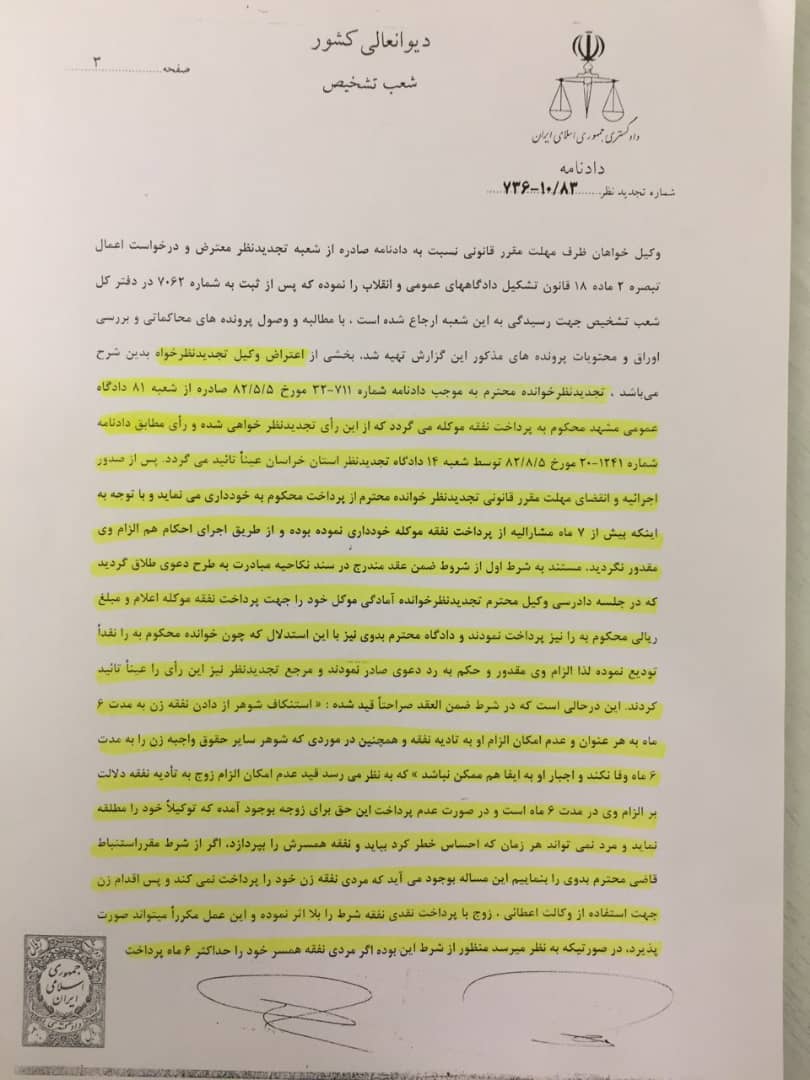 در اين پرونده به استناد اين شرط حكم به نفع زوجه با تمام حقوق قانوني صادر شد البته وصول مهريه مستقل بايد اقدام شود و اين حق براي تقسيط آن براي زوج وجود دارد كه در جاي خود صحبت خواهد شد.
