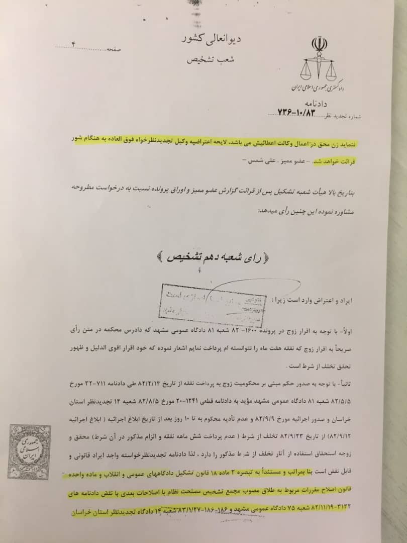 پرونده ای در سال ۱۳۸۲ داشتم که مربوط به درخواست طلاق به علت تحقق شرط اول ضمن عقد بود. موکل م شرط "حق وكالت در طلاق زوجه در صورت عدم پرداخت شش ماه نفقه توسط زوج" را به عنوان شرط اول ضمن عقد داشتند. زوج هفت ماه نفقه را پرداخت نکرده بود. در دادگاه طلاق به زوج برای پرداخت نفقه سه روز فرصت داده شد که زوج طی سه روز نفقه را پرداخت کرد و قاضی محترم به عدم تحقق شرط رای دادند، با پیگیری انجام شده و با استدلال اینجانب در شعب تشخیص  دیوان عالی کشور، که شرط تحقق یافته و پرداخت نفقه تاثیری ندارد، رای دادگاه به نفعه زوجه داده شد. در اين پرونده به استناد شرط ضمن عقد مذکور، حكم به نفع زوجه با تمام حقوق قانوني صادر شد.
